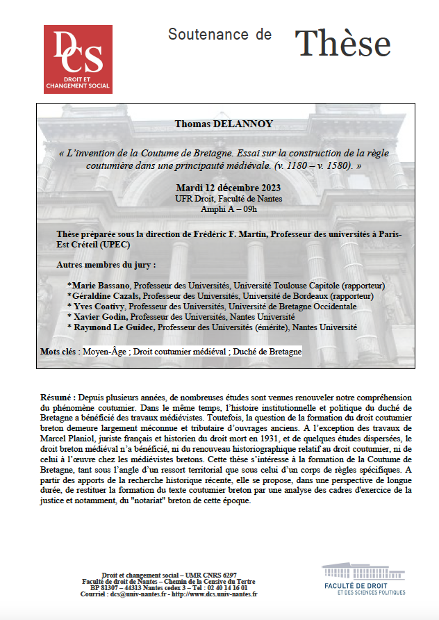 Avis de soutenance - Thomas DELANNOY - L’invention de la Coutume de Bretagne