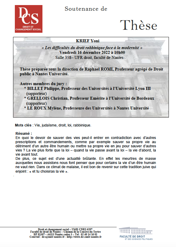 Avis de soutenance - Yoni KRIEF - Les difficultés du droit rabbinique face à la modernité