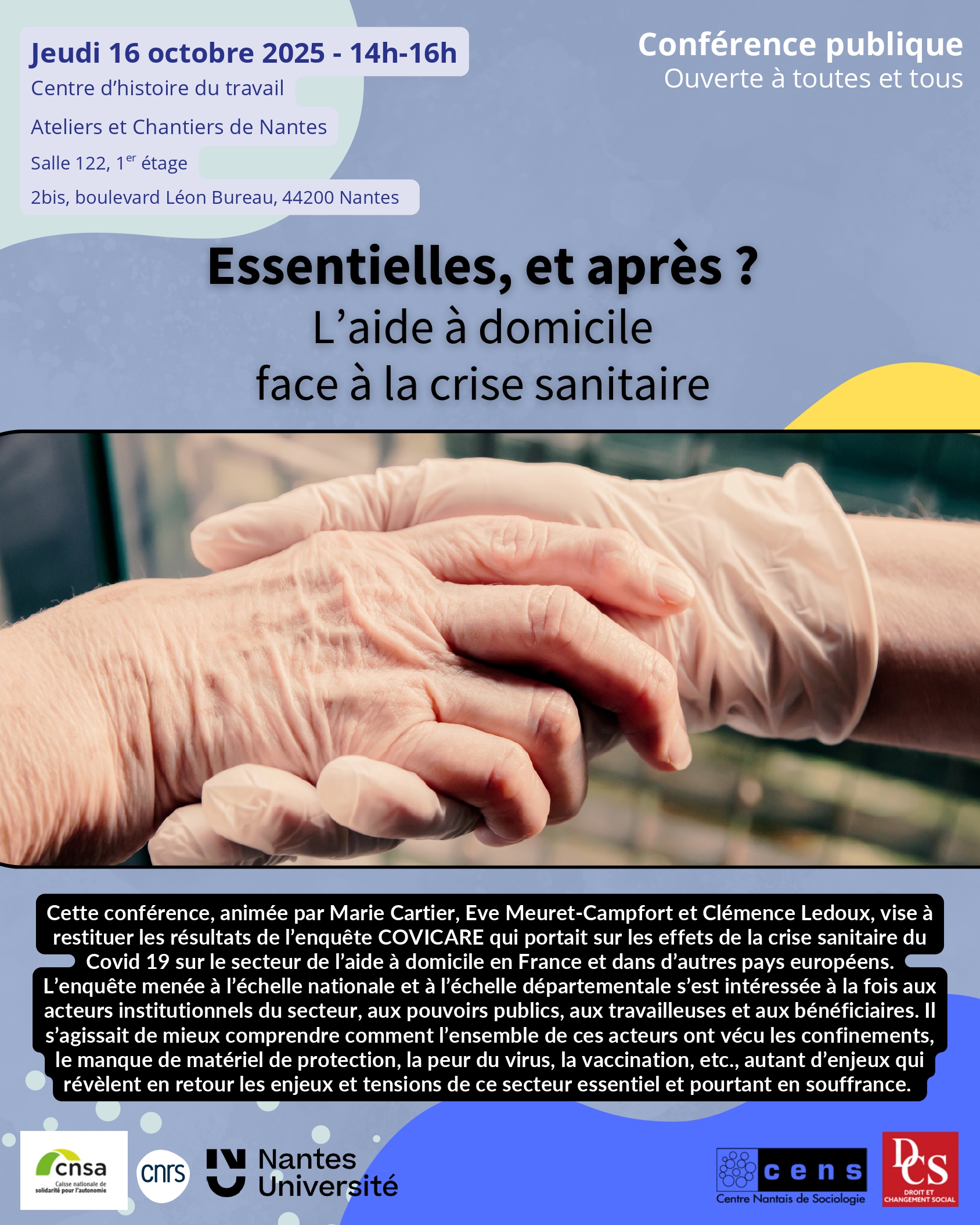 Cette conférence vise à restituer les résultats de l’enquête COVICARE qui portait sur les effets de la crise sanitaire du Covid 19 sur le secteur de l’aide à domicile en France et dans d’autres pays européens. L’enquête menée à l’échelle nationale et à l’échelle départementale s’est intéressée à la fois aux acteurs institutionnels du secteur, aux pouvoirs publics, aux travailleuses et aux bénéficiaires. Il s’agissait de mieux comprendre comment l’ensemble de ces acteurs ont vécu les confinements, le manque de matériel de protection, la peur du virus, la vaccination, etc., autant d’enjeux qui révèlent en retour les enjeux et tensions de ce secteur essentiel et pourtant en souffrance.