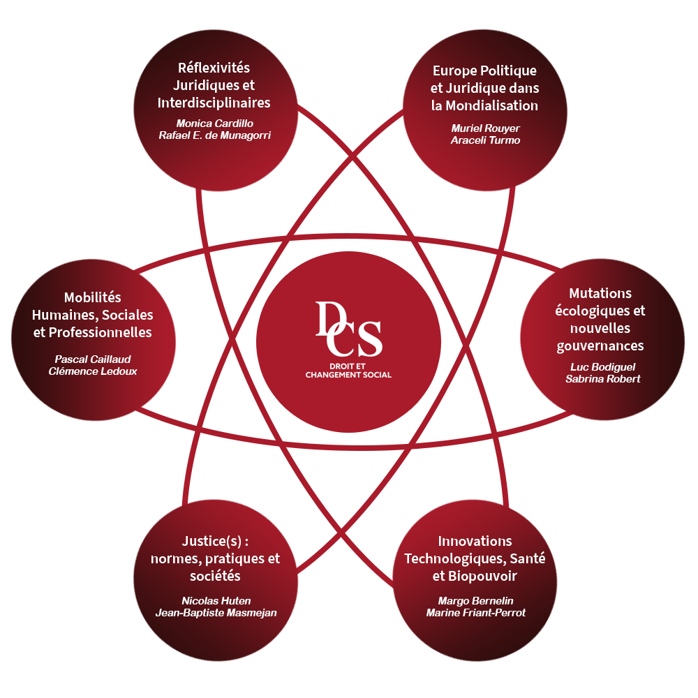 Le thème Justice(s), normes pratiques et sociétés prend pour objet d’étude la justice qui désigne ici non pas le simple système judiciaire mais les différents rouages, instances, structures et professionnels qui sont parties au système pénal, civil, administratif, constitutionnel et des droits de l’homme. L’axe est particulièrement intéressé par les objets-frontière du droit (à savoir ceux aux frontières de différentes branches du droit et/ou ceux aux frontières d’autres disciplines que le droit) et par les liens et relations entre les différentes branches du droit. L’axe est également sensible à l’interdisciplinarité dans l’étude des normes et pratiques juridiques et judiciaires et à la place qu’occupe la société française mais également des sociétés d’autres pays au sein de ces différents phénomènes.